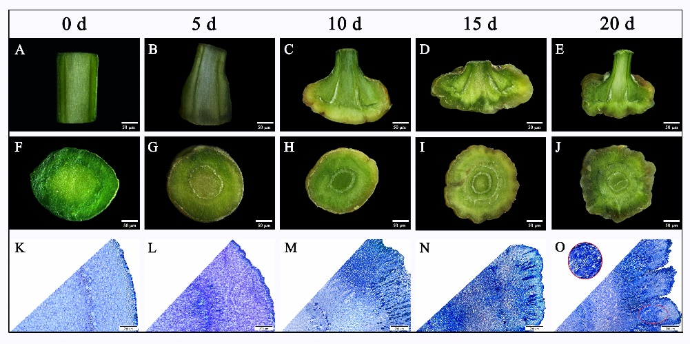 为了得到适合油桐遗传转化技术体系研究的侵染受体材料,该团队在前期油桐下胚轴愈伤组织诱导不定芽的基础上优化组织培养技术体系,通过形态学和细胞学观察相结合的方式,探索得到了适宜农杆菌侵染的最佳愈伤组织状态(愈伤组织预培养20 d侵染较佳),解决了外植体被农杆菌侵染后逐渐死亡的技术难题。