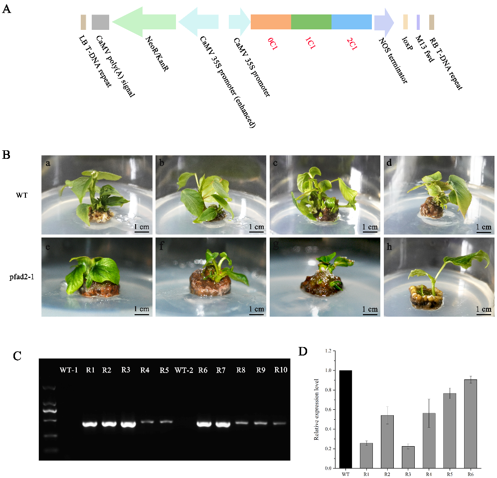 同时,该团队又对抗生素筛选浓度、菌液浓度、侵染时间、共培养方式等多个影响因素进行了筛选研究,最终成功建立了油桐下胚轴遗传转化技术体系。为了确保已建立体系的稳定性,该团队又以VfFAD2基因为靶基因,构建了RNAi载体,利用已建立的体系进行了侵染,最终成功得到了阳性芽,阳性芽转化率达7.84%。